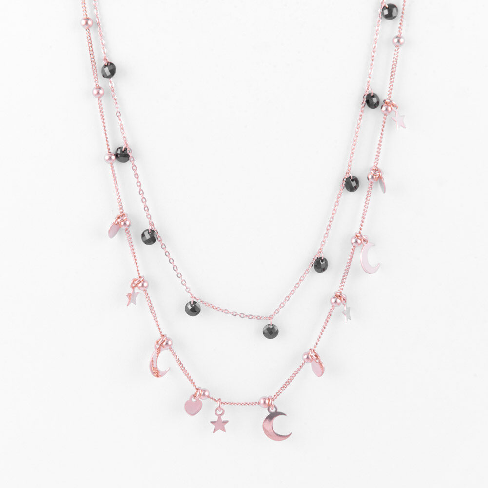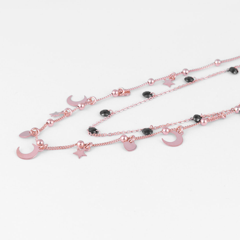 Collana con ciondoli e zirconi neri realizzata in Argento 925, colore pink. La collana è a doppio filo: la parte interna, con lavorazione a grumetta, è impreziosita da zirconi neri mentre la parte esterna, leggermente più lunga, è caratterizzata dalla presenza di ciondoli a forma di cuore, luna e stelle alternati a piccole sfere