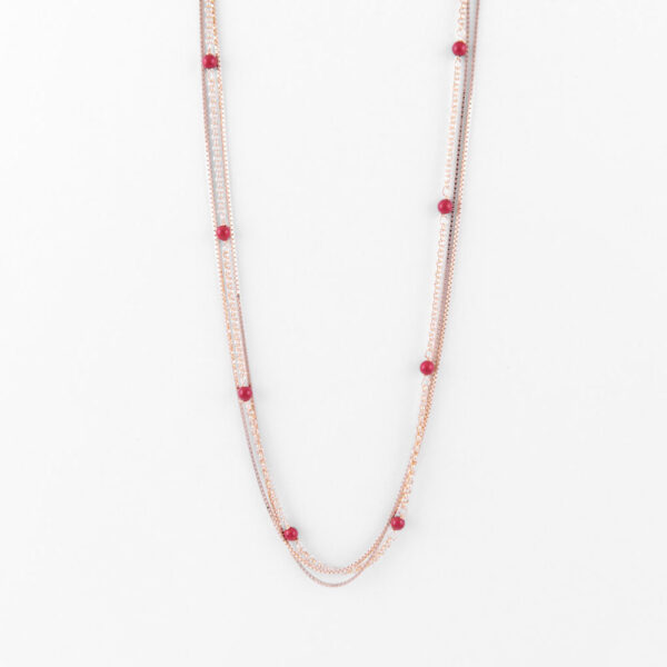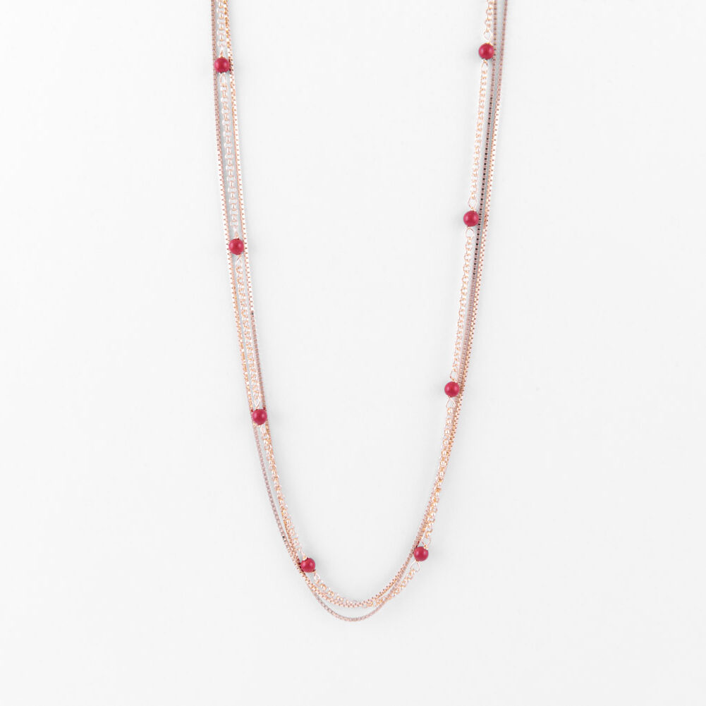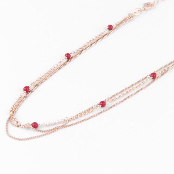 Collana multifilo a girocollo con doppia lavorazione caratterizzata dalla presenza di piccole sfere in smalto rosso.